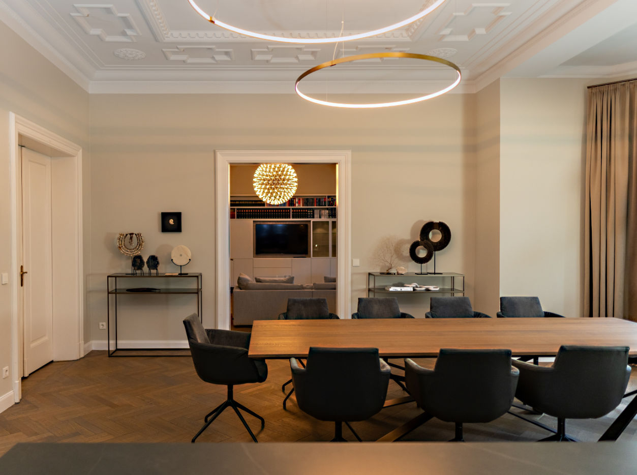 Das Geheimnis dieser Innenarchitektur liegt in einer klaren Struktur und der Art der verwendeten Materialen. Ausgereifte Lichtkonzepte, durchdachte Farbkompositionen sowie individuelle Möbelentwürfe verleihen Ihren Räumen nachhaltig ein edles Ambiente.